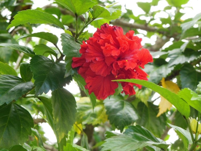 2014.08 タイ チェンライ市内。博物館近くのお屋敷の塀越しに見えたムクゲ。遠くから見た限りではバラとしか映らなかったが、ズームで思い切りアップしてムクゲであることを確認し、その深い赤色に感激。