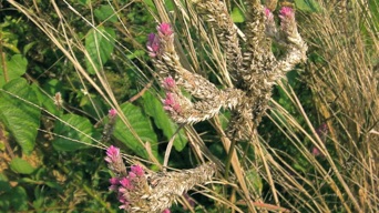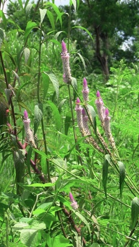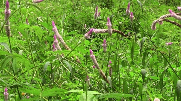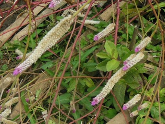 このノゲイトウは園芸品のように育てられているが、2004年2月に当方が初めてタイ・チェンライに来て宿泊したホテルは、市内のはずれの広大な田園が取り囲む昔のタイ王宮のようなホテルで、一歩外に足を踏み出すと水田雑草をはじめ多くの野草と出会ったが、このノゲイトウもその一つ。残念ながらその時は35mmフィルムで撮影していて、当時のフィルム一式が散逸してしまい手許に記録が残っていない。その時、かなり大きな川岸がこのノゲイトウに覆われているような所があり、そこで観察し撮影した。その時のノゲイトウの姿は、背の高さを測れば2mは優に越す高さであったろうと思うが、その多くは風や増水した水で押し流されたように地面に横たわるようになって足下を覆って岸辺の地面を隠していた。花はと見ると上掲のように上に真っ直ぐ伸び上がっているのではなく、自由勝手気ままにくねくね曲がったり、渦を巻いたりしていて、何かの造形の失敗が大量に捨てられていたような景色だった。それが面白くてかなりの枚数撮影した筈だが記録がないのは残念。でも、それに近い光景にはきっと再会できると思っている。