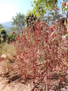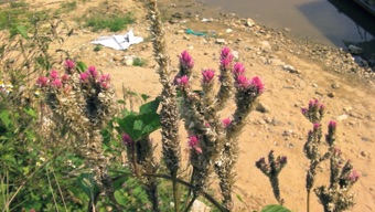 2013.03.11 HHLを出村しチェンライ市内に戻る前に、HHLと縁戚関係にある象使いのいるカレン族の村を訪ねて、研修参加学生たちは象乗り体験を行った。その象のいる村の川縁にノゲイトウがたくさん咲いていた。