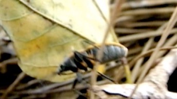 木の幹から地面に降りたテントウムシを接写で追い回している途中でフレームに入り込んだカメムシを切り出した映像と静止画。