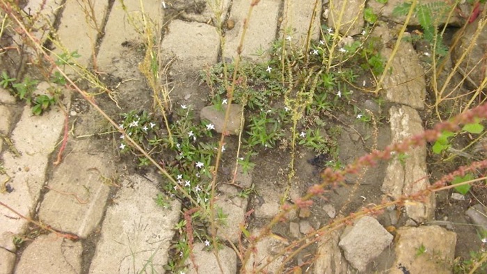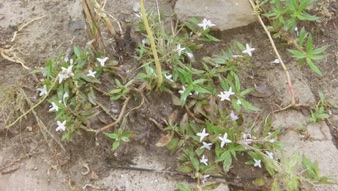 メンフィスの河原では舟運の荷揚げ場として利用された石畳の間から生えていたので草の全体が観察できた。前ページのオオフタバムグラとは同属であり、葉の形や生え方は良く似ているが花の大きさがメリケンムグラの方が遥かに大きく、花の表面に細かい毛がたくさん生えているので見分けは付きやすい。
