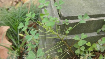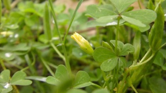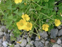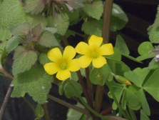 以外とどこにでもありそうなのに見つからなかったカタバミの仲間。前のページのイモカタバミと小さなコンクリートの橋を隔てた場所で見つけた。イモカタバミは開花しているのに出会えたが、こちらはまだつぼみの状態だった。が、左上の写真に見られるように茎が立ち上げって成長しているのでオオタッチカタバミであることが見て取れた。