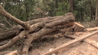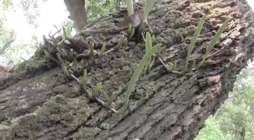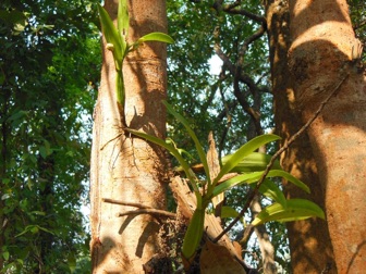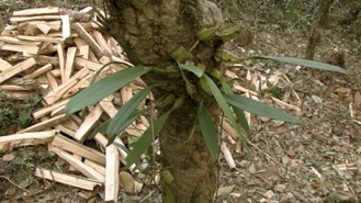 2014.03.05 パユヤム村の尾根の防火帯整備作業の撮影中に撮影したもの。別の木に着生していたものが。何かの原因で地面に落下したのを村人が近くの木の又に保護したものと推察した。ランであるか否か=価値が有るかないかではなく、森に生きる生命全般に対する心配りである。