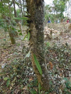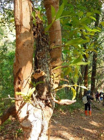 村人が手に持っているのはデンドロビウムの多分クリソトキサム。派手な花を咲かす種でないと評価が低いようだ。ということは、バルボなど着生している野生ランをこのまま放っておくとこの木が片付けられる=薪として切り刻まれると、ランも薪かゴミになってしまいかねない。ということで、手近な株を採集して村に持ち帰り、一応ジャン氏のOKを得て、村に生えている木の幹にせっせと紐で結わえたり、釘で打ち付けてきた。単なる気休めでしかないし、村人にとっては余計なお世話だと思う。でも、何でこんなことをするのかと疑問を持ってもらえれば何もしないよりかはいいのかも。