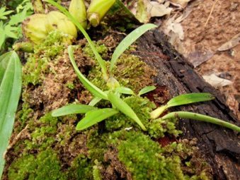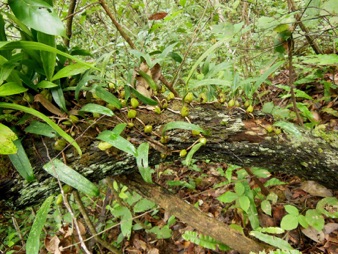 2014.08 HHLの南の稜線に出る直前の林道脇に切り倒された木があり、その谷に向かって落ちかかった倒木の先の方にバルボフィラムが沢山着生しているのが見えた。このままだとランもろとも谷に滑り落ちてしまいそうだったので、手の届く範囲のバルボを採集して近くの木に移し替えた。この倒木には10種類近くのランが着生していて、それらを一緒くたにバルボフィラムとしている。