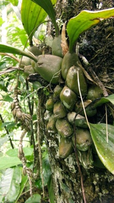 花がないので同定は当たるも八卦程度。昔、ドーム・ラン展で買って育てた記憶があるが、写真などは残っていない。現地でこの株を見つけた時、ここにも写っている種子の形が当方にとっては馴染み深いものだったので、自宅で育てていたランであることはすぐにわかった。周囲を見渡すと細い山道を挟んだ向かい側にある木のかなり高いところに大きな株を見つけた。チョッと目にはアグレガツムのように見えたが、数珠のように垂れ下がった種子が見えたので、同じホリドータの仲間と推測できた。