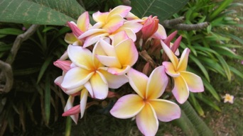 2013.08 タイ、チェンライ市内。上の白い花は市内の庭園、下のカラフルな花はホテルのプールサイドのもの。