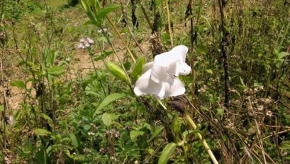 シロゴチョウは大きな白い花を咲かせるマメ科の野草であるが、ここに写っている葉がこの花のものだとするとマメ科の特有の葉のかたちではない。どちらかというとクレマチスの葉や蕾の形に似ている。