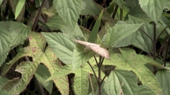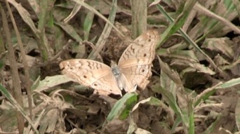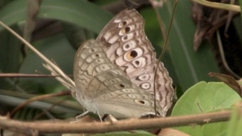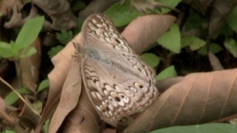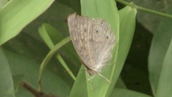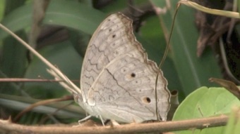 かなり翅も痛んで弱った状態の個体であったが、翅の模様の特徴からハイイロタテハモドキと判断した。