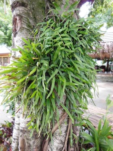 2013.08 村に行く途中の食堂の木に着生されたシダ。いつも観察しているイワダレヒトツバよりも細く、葉全体を覆う細かい毛も目立たないことからいつもとはチョッと変わったシダと感じた。葉を裏返して胞子嚢を見ると葉の先端部だけについているので、イワダレヒトツバよりもノキシノブに近いと考えた。正確には日本のノキシノブの胞子嚢は丸いのでかなり違う。