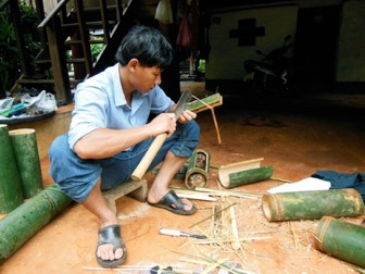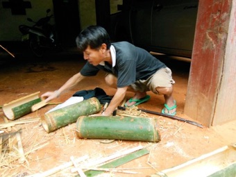 2013.08 HHL 村の竹を使って日本から一緒に行ったご家族の夏休みの作品作りをお手伝いしようとして、この最上段の村人の後ろにある太い竹をいただいた。この丸太の状態で何を作るか、そしてそれを切り出す図面や完成予想図をスケッチしてもらい、それを下に竹を切って行った。切り花を活ける花入れを作りたいということだった。そのアイデアを引き出させた立派な竹で、外側からは申し分のない材料だったが、切り割ってはじめてわかったのは花入れの底となる節のところに虫が行き来する小さな穴が開けられており、水を入れる用途に供することは難しい状態だった。どこか1カ所くらい穴の開いていない部分がないかと一つづつチェックしながら切って行ったが全て駄目。そうなると切った竹を丸い鉢にするか小割りにしてバスケットにするしかなかった。