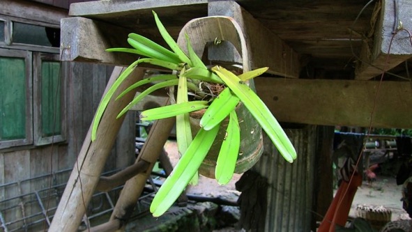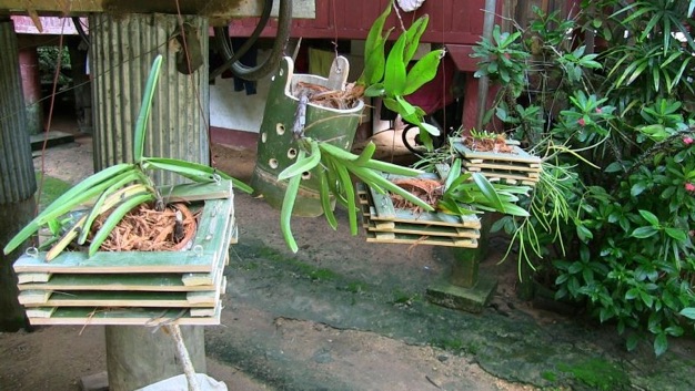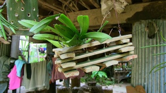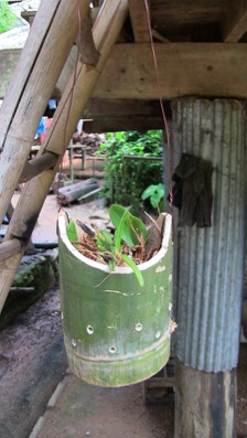 2013.08 HHL 鉢底の部分に竹板を噛ませて台座にし、空気の流通を確保している。白やピンクのラベルは植え込んだ期日とランの花色を示している。植え込み材は、ヤシの実の繊維+炭+村の土。肥料などは施していない。次回行く機会があれば持参しても良いが、村の天然資源を活用することのほうが大切。コンディションを見て村人が考えてくれるのが望ましい。鉢が壊れたり、植え込んだランが枯れることによって次の工夫が生まれる。