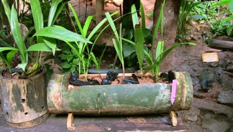 2013.08 HHL これはいわゆるバスケットであり特に説明することもない簡単な構造と加工。のこぎりで丸竹を任意の長さに輪切りにし、それを鉈で縦に割り、手動のドリルで穴をあけ、短く切った針金でつなぎ止めている。四隅の針金の上部は紐を通おせるようにしておき、対角に針金をわたしている。植え込み材はヤシの実の繊維と炭。空気が停滞するのを嫌う種の植え込み用である。