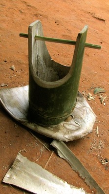 当方はのこぎりを使って開口部を作ったが、村人は山刀を2、3度振るうだけでいとも簡単に開口部を作る。でも、前回も記したが、村人は道具が好きで今まで手にしたことがない道具があると必ずと言っていい程手に取って感触を確かめ、時間がある時は使ってみている。自分たちの道具で出来てしまうことでも、異なる道具を使って加工することの感触を確かめているようである。