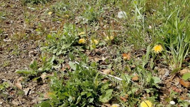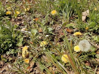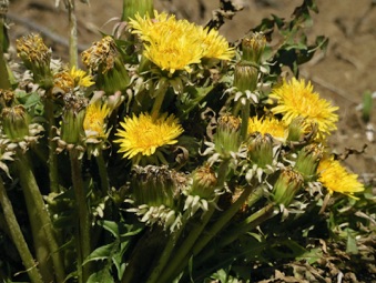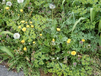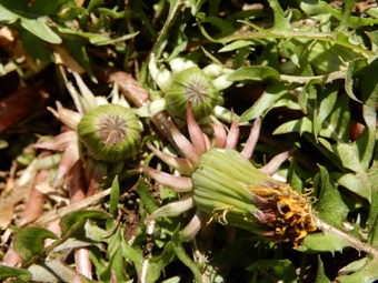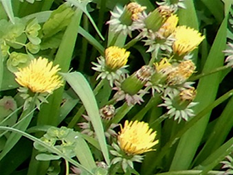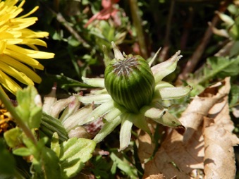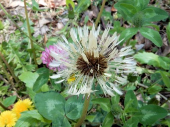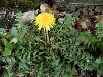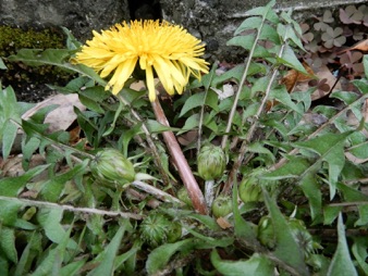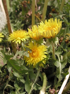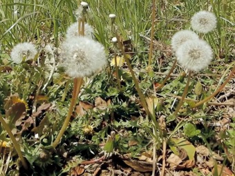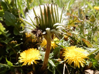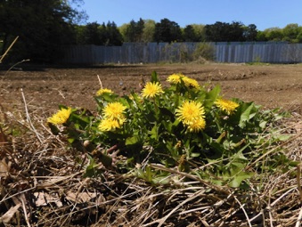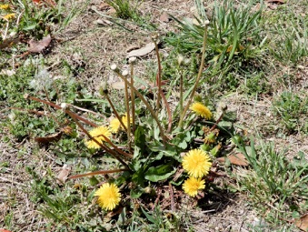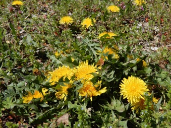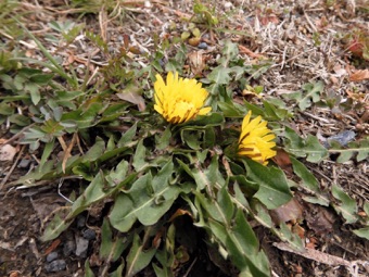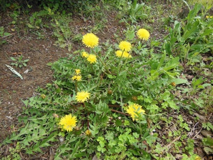2005.05.05 ガイコツ山 上の関東タンポポとは半月くらい時期が遅く最盛期となる。上の関東タンポポは林縁で咲いていたもの、西洋タンポポは陽が降り注ぐ広い畑地の跡という差はあるが、現在でもどちらもすこぶる元気に花を咲かせている。西洋タンポポはヨーロッパでは野菜として食べられていること、葉を見ればミズナに似ているので今度食べてみよう。(ミズナはアブラナ科)