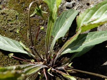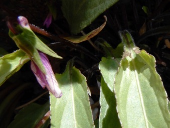 アツバスミレの葉は他の種より厚い。左は葉裏、右は若い葉、軸に翼がついているのが見える。この蕾は距がまだ赤くない。