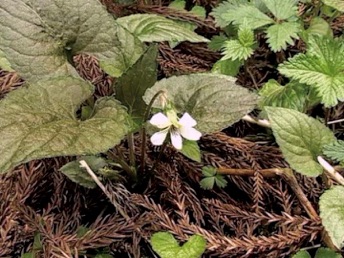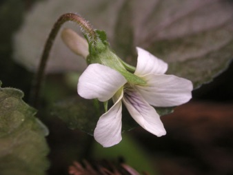 この高尾スミレは三ツ沢の左岸の支沢に沿った林道を登った南に面した杉林の縁に生えている。葉の裏は杉の枯れ葉で染まったのかと思う程紫色に染まっていて、シソの葉のように見える。
