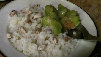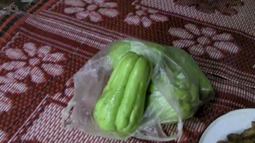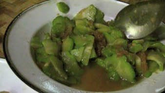 2013.08 HHL/チェンライ 白カレン族の村。 2010年と同じウリの栽培棚。今回は10日間、ホームステイ先のお宅で食事もさせていただいた。そのメニューの中にこのウリも入っていると教えていただきながら食べたのであるが、瑞々しくて大変おいしかった。