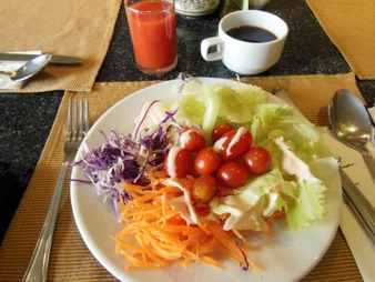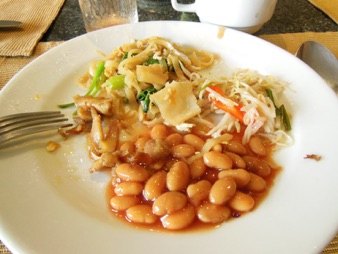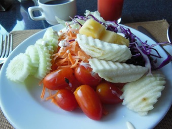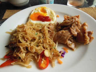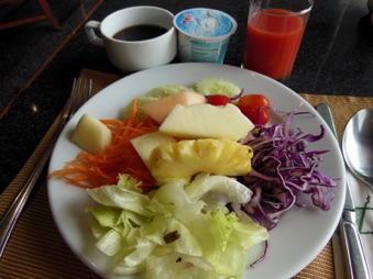 上はそのウィアン・インの朝食。左はサラダの皿、右は一応メインの皿。今回はパンや米は控えた。それでも年寄りには多いかな。