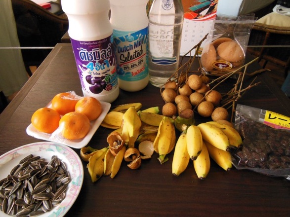 これは当方のチェンライ市内を撮影する時持ち歩く昼食兼非常食。果物は前日、市場で撮影するために試食した残り。ホテルに持ち帰らず途中のゴミ箱に置いてきたものもあり、一人というのは結構無駄が多い。