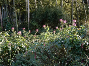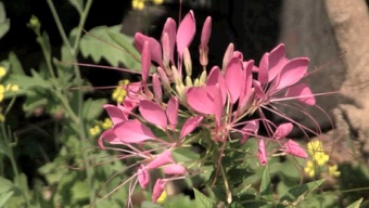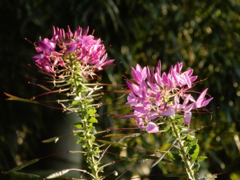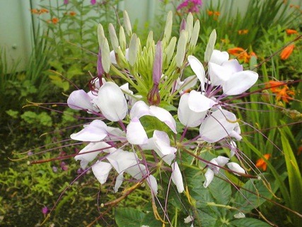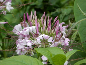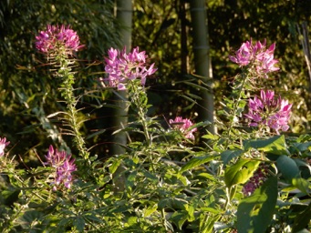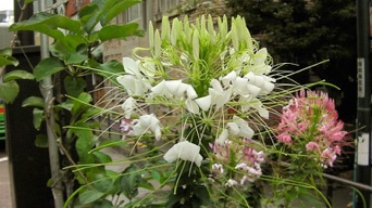 クレオメはチョウが舞っているような優美な姿に似ず、葉や茎に触れるとクサギのような強い臭いを放ち人を寄せ付けまいとする。中段右の写真にあるように花後菜の花の種の莢のような袋を付け、熟すとそこから黒い小さな種が飛び散り次代の子孫を地上にばらまく。優美さと、皮肉さとたくましさを併せ持った麗人である。