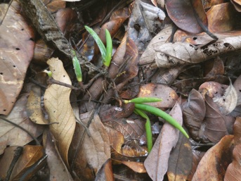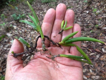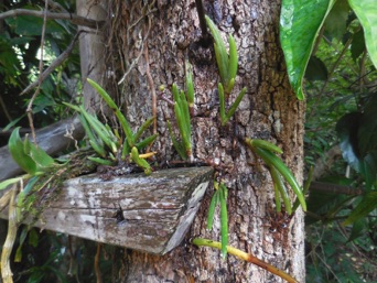 南尾根筋で梢近くに小さなランを沢山纏った大きな木を見つけた。ビデオを拡大しても逆光の所為もあって良くわからない。そこでその木の根方を丹念に探しまわったところ、上から落ちたと思われる小さな株を見つけてしまった。一つ見つけられるとその後は簡単、結構沢山落ちていた。それをビニール袋に入れて村に持ち帰り、川岸にある村人の洗濯場脇の木に又釘で固定した。活着するかどうか、花を見せてくれるかどうかこれからのお楽しみ。