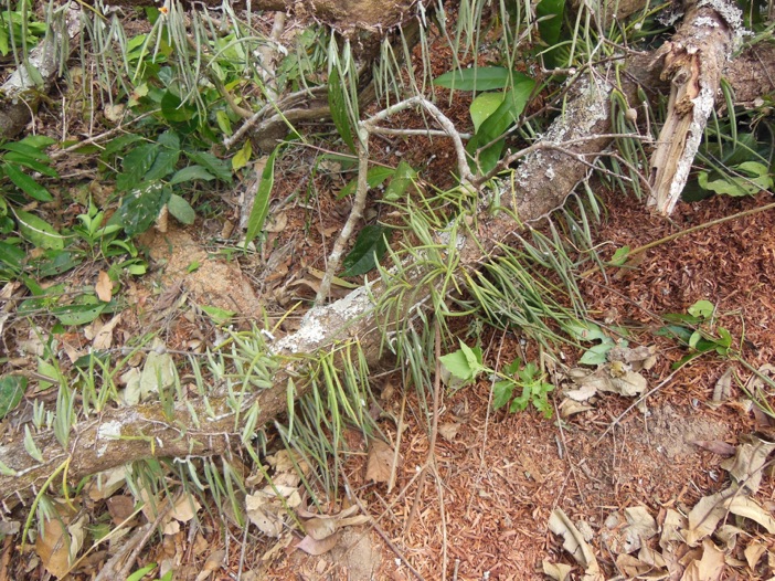 2015年8月HHLの南尾根で撮影した「ニワトリの足のラン」の着生状態を撮影した。というのは、HHLで撮影したのは大きな木の梢に着生しているのを見て、地面に落ちているものがないのか探し撮影したもの。落下ランとでもいう状態の姿だった。BMKは切り倒された木に着生していたもので、これも正確には自然の状態とは言い難いが、少しは生育状態に近い状態を見てもらえる。