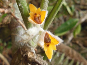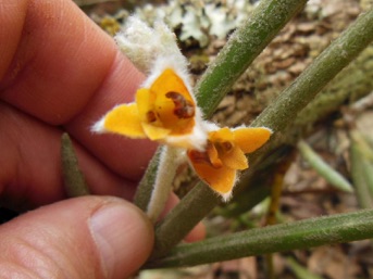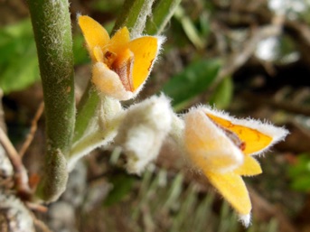 更に、種名を探す手立てとなった花を撮影できた事がうれしい。蕾の段階から白い産毛を纏っていて、その産毛を付けたまま開花している。指先と一緒に写っているカットで大きさと云うか小ささが分かると思うが10mm程度である。従って村の人の評価・採集の対象とはならず、このまま放置すればいづれ消滅してしまうのではないか。