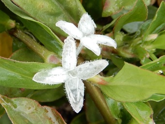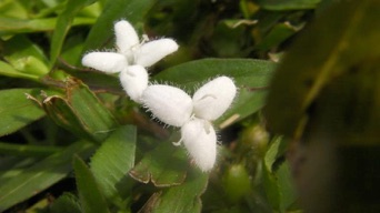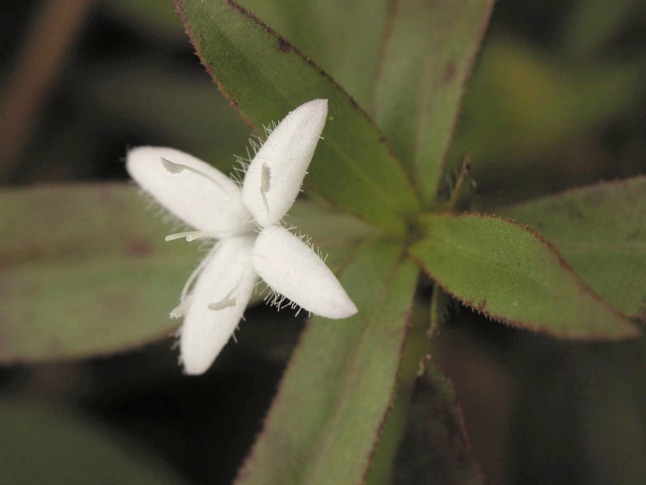 ここに記述するまではオオフタバムグラと同定していた。オオフタバムグラの資料と付け合わせると、こちらの花びらには細かい毛が見えるのと、葉が平たく薄いので、同じ仲間のメリケンムグラと変えることにした。