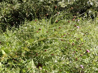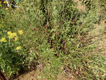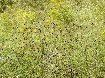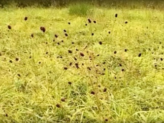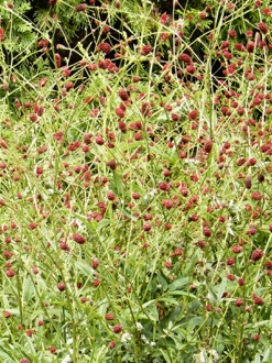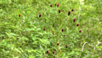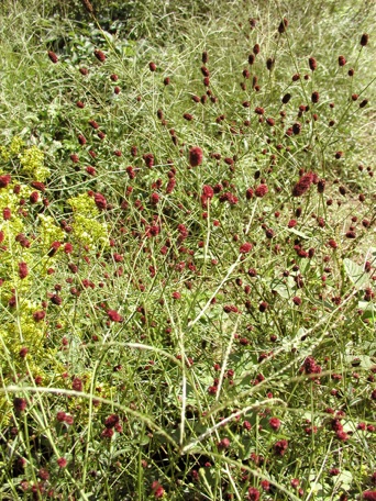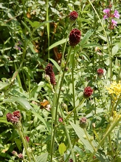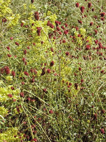 森林公園の野草園で撮影したもの。このワレモコウは小型の緑色のウスバホソカスミカメムシの大好物。赤い花に沢山付いているので、このワレモコウを撮影したいのかウスバホソカスミカメを撮影したいのか焦点がわからなくなる。ウスバホソカスミカメのページを参照してもらえれば、花のアップが見える。虫の嫌いな人には勧めない。黄色く写っているのはオミナエシ。