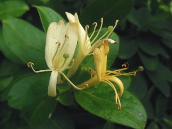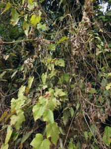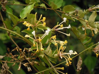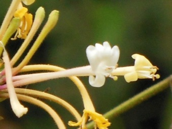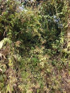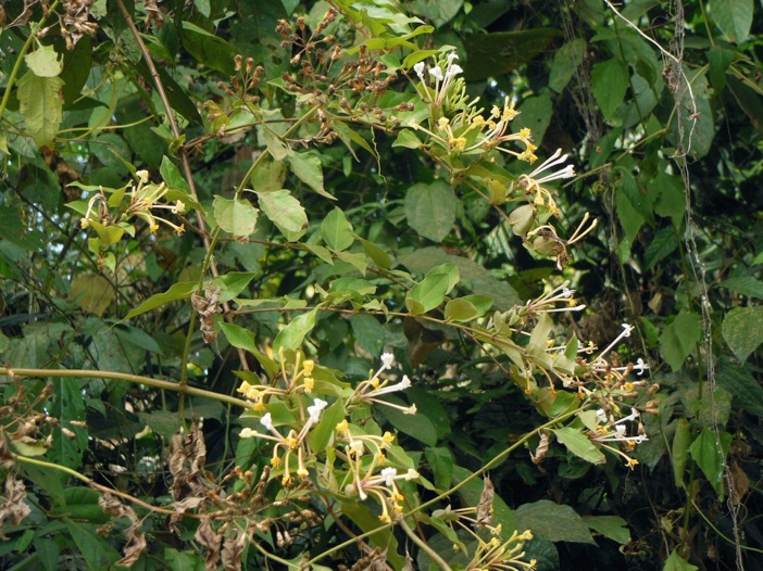 BMK小中学校の南側、道路に面したところは川に近づくにつれ3〜4mの崖のようになっており、そこにこのスイカズラ様の蔓が絡まっていた。白く咲いて褐色に萎んで行くところや、花をUPで見て行くと花の形そのものも似ているように感じる。ただ、スイカズラの実は赤ではなく黒。