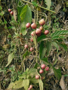 帰国してから写真を下に調べたところ、スイカズラの仲間の実には有毒のものがあるようだ。写真だけで正確な同定は出来ないが、ネムロブシダマという種に近そうだ。