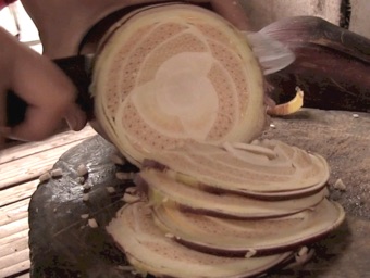 これまで何度かバナナの蕾を野菜として販売しているのを撮影してきたが、実際それをどのように食べるのかは知らなかった。今回、村の中学生が家の手伝いで調理しているのを見る事が出来た。またその日であったか、別の日であったか覚えていないが、それを揚げたものを食べる事も出来た。味はご自分でご確認下さい。当方の関心は、食材としてのバナナの蕾みにもあったが、切り口の描き出した意匠・デザインにより強く惹き付けられた。何でこれがバナナになるのかよーく観察すると面白いです。