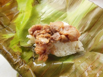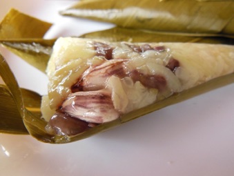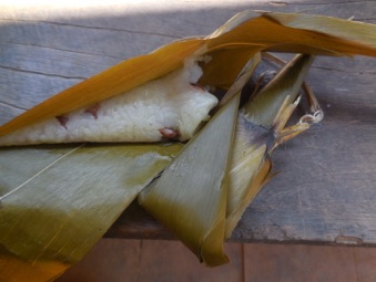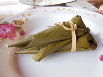 チェンライMFUの学生さんがおやつに持参した鶏肉の具の乗ったチマキ