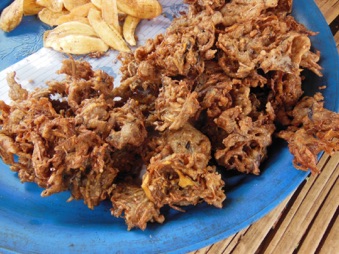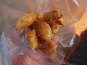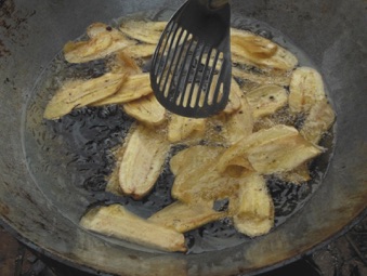 前半の動画がバナナの衣揚げ。後半の静止画のスライドショーはバナナチップス。これらは村の小中学生が休み時間におやつとして買いにくる。当方もつまみ食いさせてもらったが、青いバナナなのに油で揚げることによって甘さが引き出され、また衣を纏うことでほくほくした芋のような口当たりになって大変美味しかった。