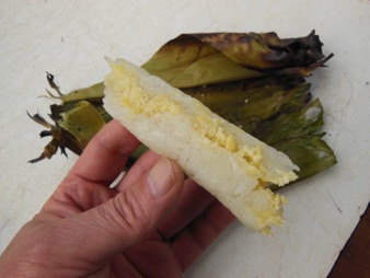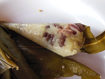 村に行商に来た車に積まれた甘く味付けされたマメ(黄色い部分)を包んだチマキ