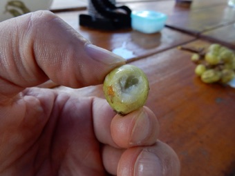 すごく渋い。口に入れたままほんの少し我慢すると、口の中がすごくすっきりしてくる。今回のBMHHでもデザートに出されたが、その時は、これを口に含んだ後に水を飲むと水が甘くなるというご婦人の説明だった。結構これは癖になる果実だった。