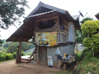 これは村内のコンビニの一つ。コンビニであることよりも、長い下屋を張り出した形が当方は何か心引かれること及び、階下の周囲をブロックで囲っていることだ。既にこの建物以外に階下を板やブロックで塞いでしまっている建物が何棟もあったが、この傾向はこれからもどんどん拡がって行くだろう。山の民としての何かを振り払いながら。