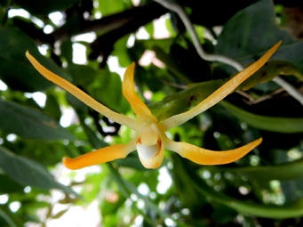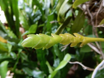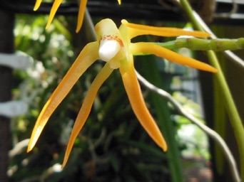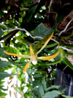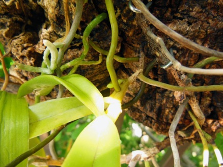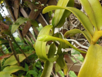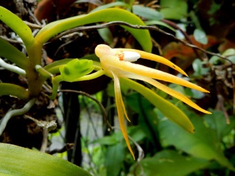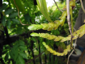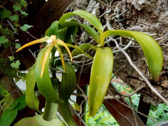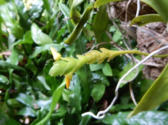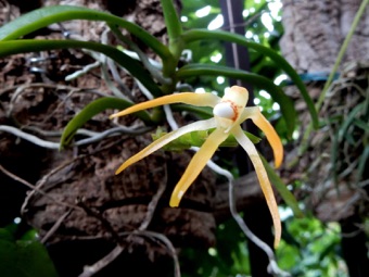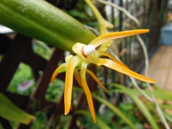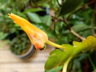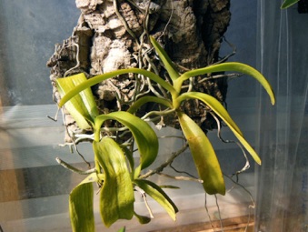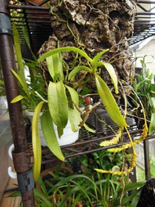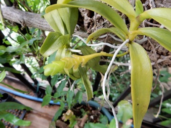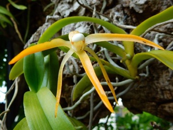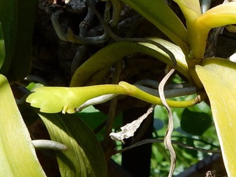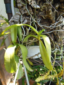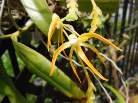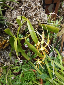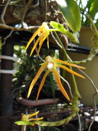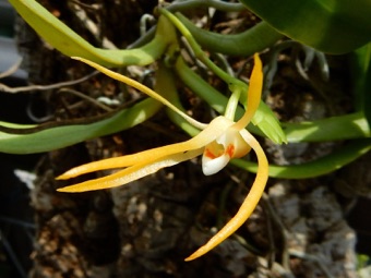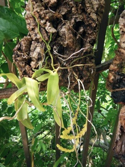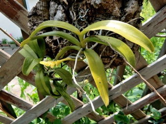4枚の写真の内、左上の状態で開花した。このランやレプトテスはこのようにひっくり返って咲くことが多い。ヘゴやコルク着けのいいところは好きな位置に置けるところ。左上以外は3枚ともひっくり返して撮影している。