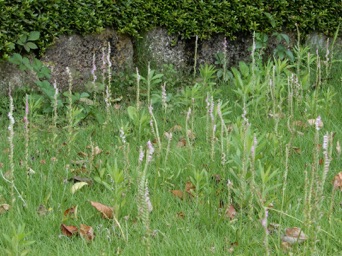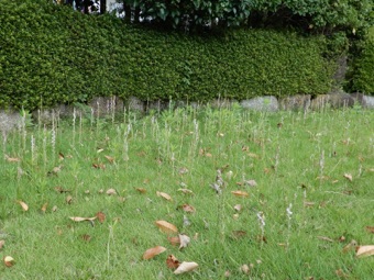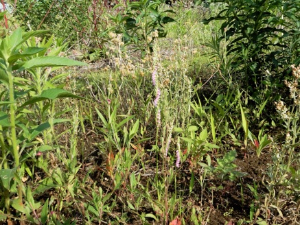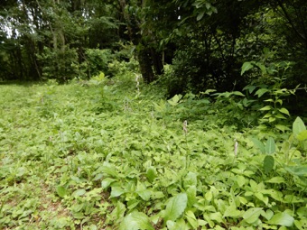 ガイコツ山の中のネジバナのたくさん見られるところ。=一度林が切り倒された後、植樹のためにか新しい土を入れられたところ。ネジバナがたくさんあることでその状況が窺われる。