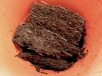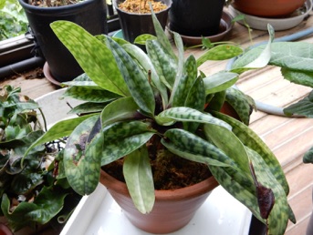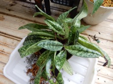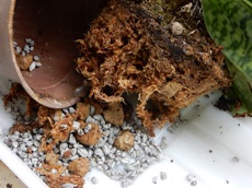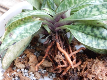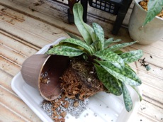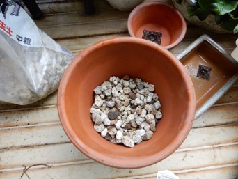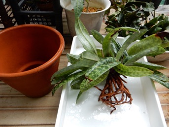 パフィオ(黒)は株が大きく、また株元がしっかりしているので無理に株分けすることに躊躇いがあったので、2周り大きい素焼き蜂に植え替えることにした。根をきれいに水洗いした後、1/3ほど軽石を敷いた上にミズゴケを薄く敷き、その上に根を開くようにミズゴケを抱かせて鉢に据え、その上から根を覆うように、また株がぐらつかないようにミズゴケを軽く詰め完了。落ち着くまで強い日差しには当てない。