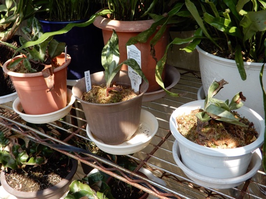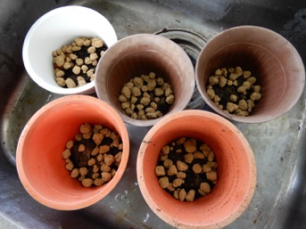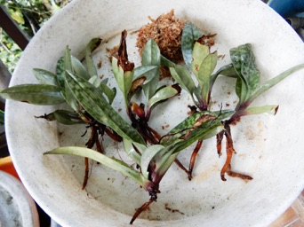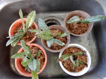 ラオスのパフィオを植え替えたついでに黒いパフィオも植え替えようと、鉢から取り出して古い水苔を洗っていたら、一昨年の植え替え時には一つに固まっていた株がバラバラに5株に別れた。こうなったら5鉢に植え替えるしかない。右上は鉢底石がなかったのでヘゴで代用。その上に大粒の赤玉土。微塵を水洗いした上に1cmくらい水苔。その上に水苔で包んだ株を置き、更に水苔を補填した。
