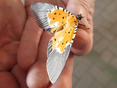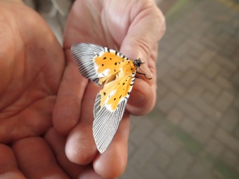 チェンマイ市内、ナイト・バザールの一画の出店のスポットライトに飛んでいるのを見つけ素手で捕まえた。同行のMr.Y Yamada氏のカメラで撮影してもらったもの。チョウのことを全く無知であると自覚したのは、右下の写真が証しているように、こんな持ち方をしたら自らの脚を犠牲にしても束縛を逃れるのが野生であることを忘れていた。記録だけ穫れれば傷つけるつもりはなかったという中途半端がこのチョウ?ガ?の脚を奪ってしまった。
