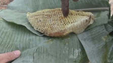 ・「コミツバチの巣01」は、モー村長のお父さんが採集して来たもの。形状が平らなので東洋のミツバチの巣のようでもあるが、中