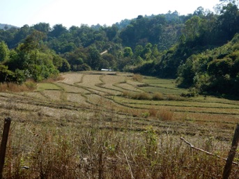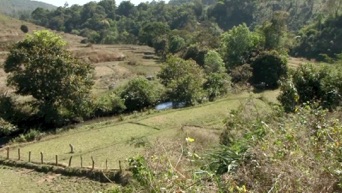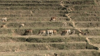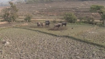 Mae Ya川に接する水田地域では川に沿って緩やかな傾斜が広がり、そこに等高線を引いたように高さ1mほどの段差を設けた棚田が連なっている。これまでの白カレン族の取材の中で数回取り上げているが、ウシや水牛を飼育し、乾季、水田に水の張られていない季節には、水田の雑草を食べさせ、またそこで排泄させることによって肥料としても役立たせる。雨季が近づき、水田に水を入れる頃は田起こしや耕耘機を引く労働力としても使役・機能を果たす重要な存在。