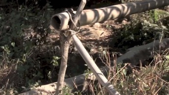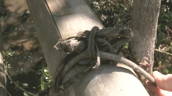 「メーヤ川に架かる橋2」動画の後半に、当方が材料として推測した細い蔓/つるを捉えている。映像をよく見ると蔓を山刀で断ち切った痕跡が数カ所写り込んでいて、推測を補ってくれているようではあるが、正確なところは確認できていない。BMHHほかの結束方法は主として「捩る/よじる」。素材そのものを捩る、または素材を輪の状態にしておいて、その輪の中にバールのような道具・工具を差し込み、それを捻る・捩ることによって対象を結びつけ・絞めつける方法を良く目にする。