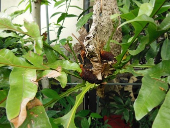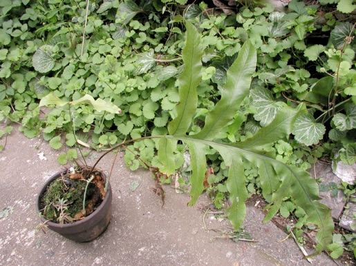 現在でもその勢いは変わらず、水苔植えの鉢には必ずといっていい程侵入する。嫌いなものであれば鉢の主を尊重して、後から侵入してきたものを排除するのだが、このダイオウウラボシに限らずシダが他所の鉢で芽を出したときは、どちらを生かすか悩んでしまう。大概は両方を分けて、両方とも生かそうとするのだが、シダは小さい時に移植しようとしてもほとんど失敗する。大きくなってからだと,鉢中に細い根が回ってランの方が弱ってしまう。