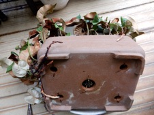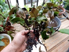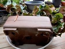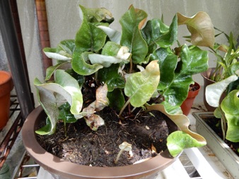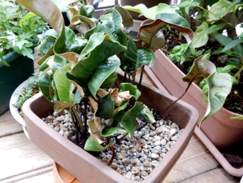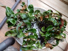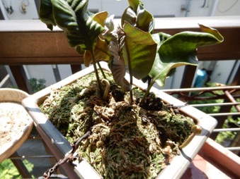 2013.05.21 植え替える直前の状態。右上のヘゴ鉢のまま水盤で育てていたが根が外に溢れてきた。