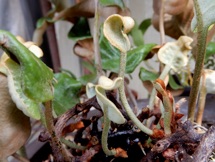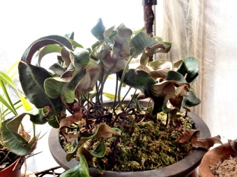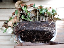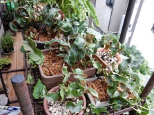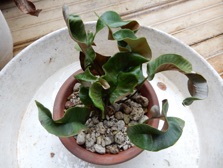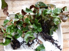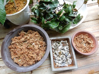 用土は軽石のみ。急に乾かないように水苔を被せて保湿しているのはいつもと同じ。小さい鉢に植付ける時にはミズゴケが足りなくなり株の押さえとして上にも軽石を並べた。さてどうなることやら、1鉢が5鉢になってしまった。また貰い手を探さないと。
