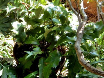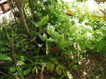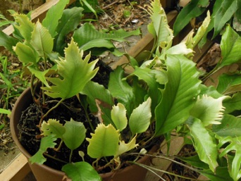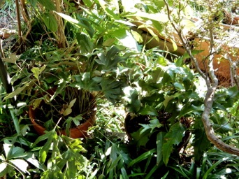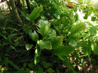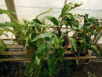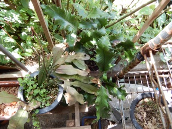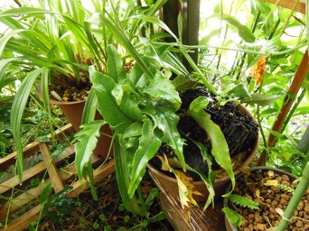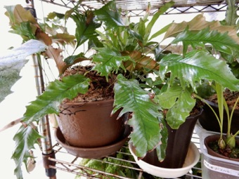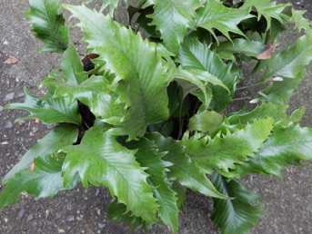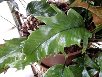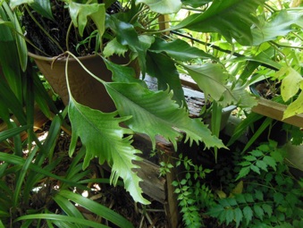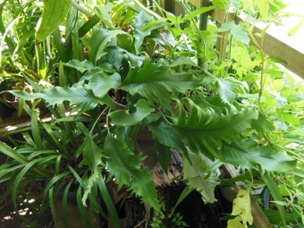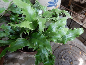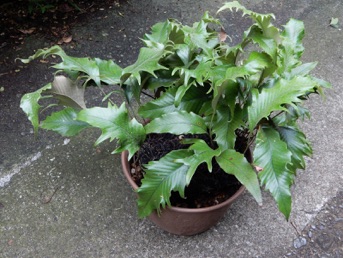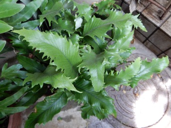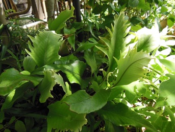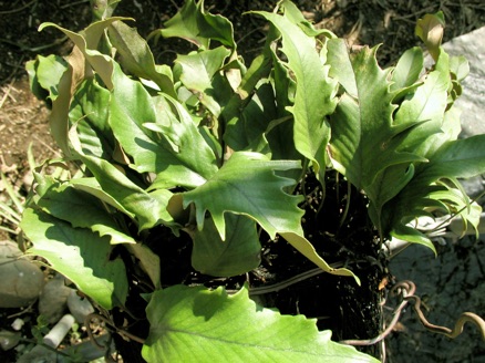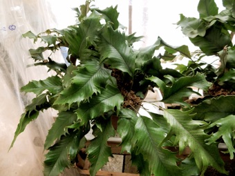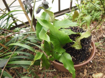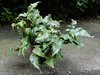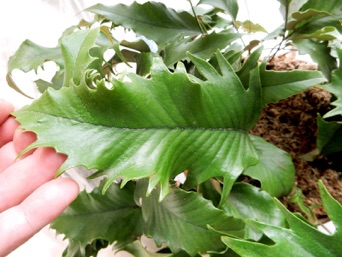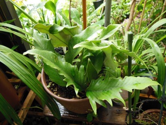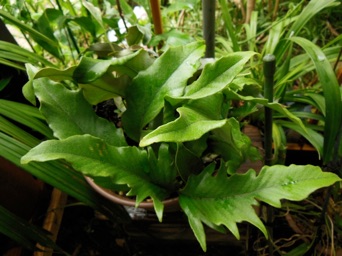 2008.03.08:クジャクヒトツバというのはヒトツバの葉に不規則に突起がでるタイプ。これもヘゴ鉢で育成。
